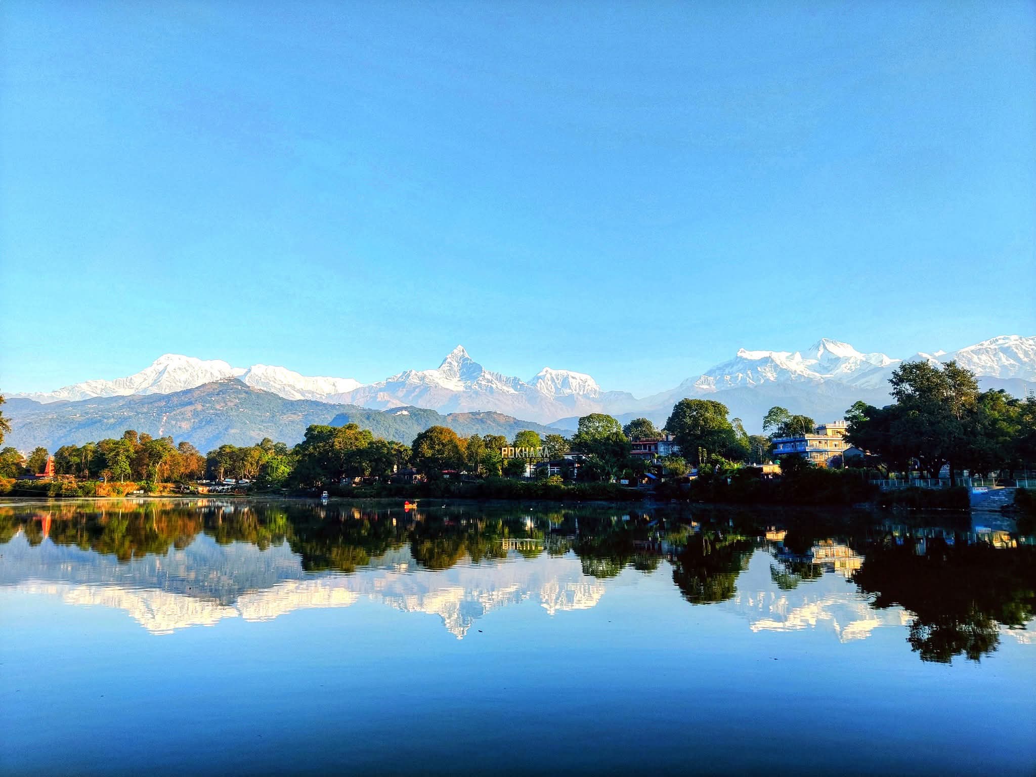 In the photograph captured on Monday morning, the serene blue sky, lush greenery surrounding the lakeshore, and the immaculate reflection of the Himalayas combined to showcase one of Nepal’s most enchanting natural landscapes. Such clear views are often associated with the post-monsoon and winter seasons, when the air is crisp and visibility is at its best.