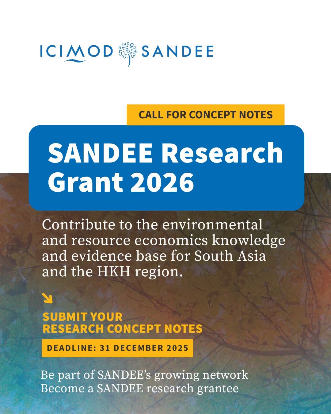 Kathmandu, Nov 25, 2025 -The South Asian Network for Development and Environmental Economics (SANDEE), under the International Centre for Integrated Mountain Development (ICIMOD), has opened its call for research concept notes for the SANDEE Research Grant 2026. The program aims to strengthen research capacity in environmental and resource economics across South Asia and the Hindu Kush Himalaya (HKH) region.