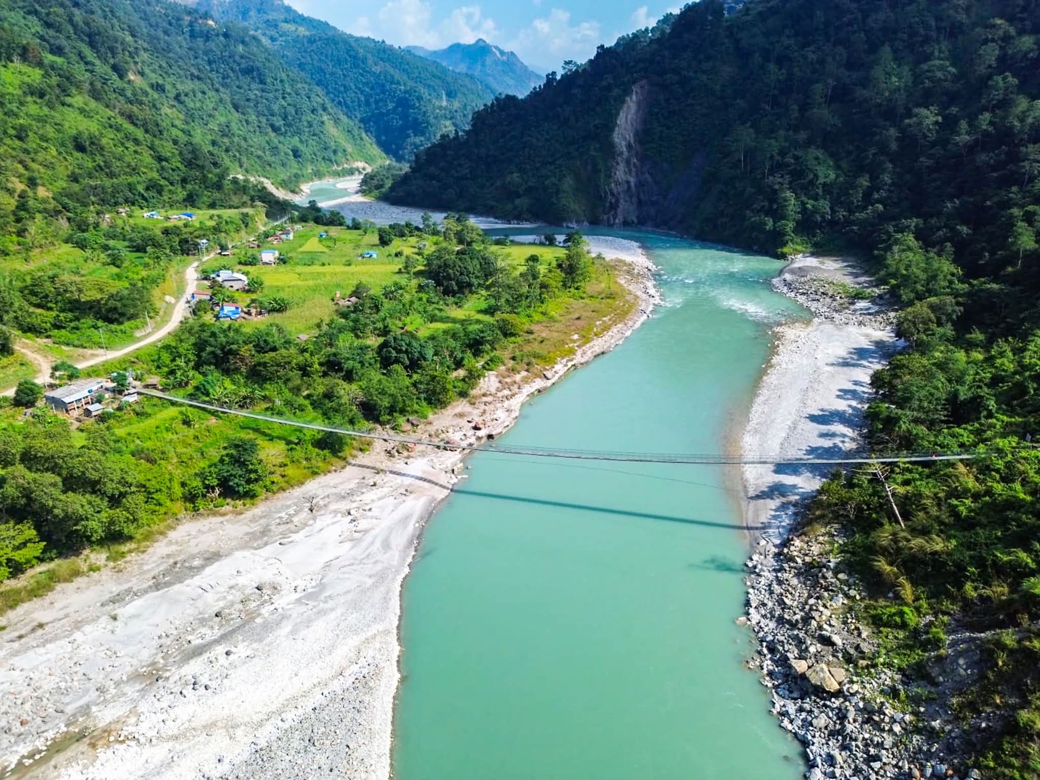 The Seti’s distinct turquoise flow, captured between forested hills and cultivated fields, reflects the river’s role as both a life-supporting ecosystem and a geographical link between two diverse regions. On one side lie terraced farmlands and scattered settlements of Tanahun; on the other, the expanding rural networks of Chitwan. For residents, the river is not an obstacle-it is a shared resource and a familiar companion.