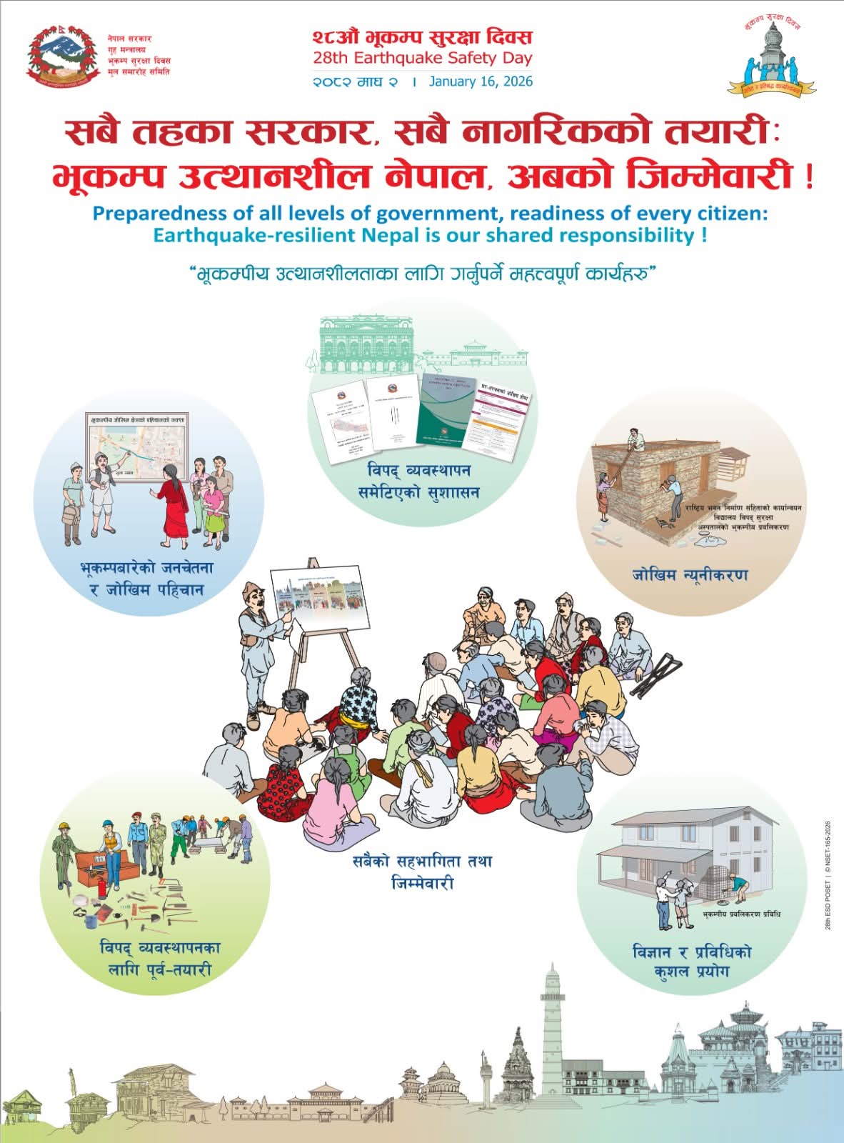 This year’s Earthquake Safety Day slogan - “Preparedness of all levels of government, preparedness of all citizens: An earthquake-resilient Nepal is now our responsibility” - underscores the shared role of government bodies and citizens alike in safeguarding communities from future seismic hazards.
