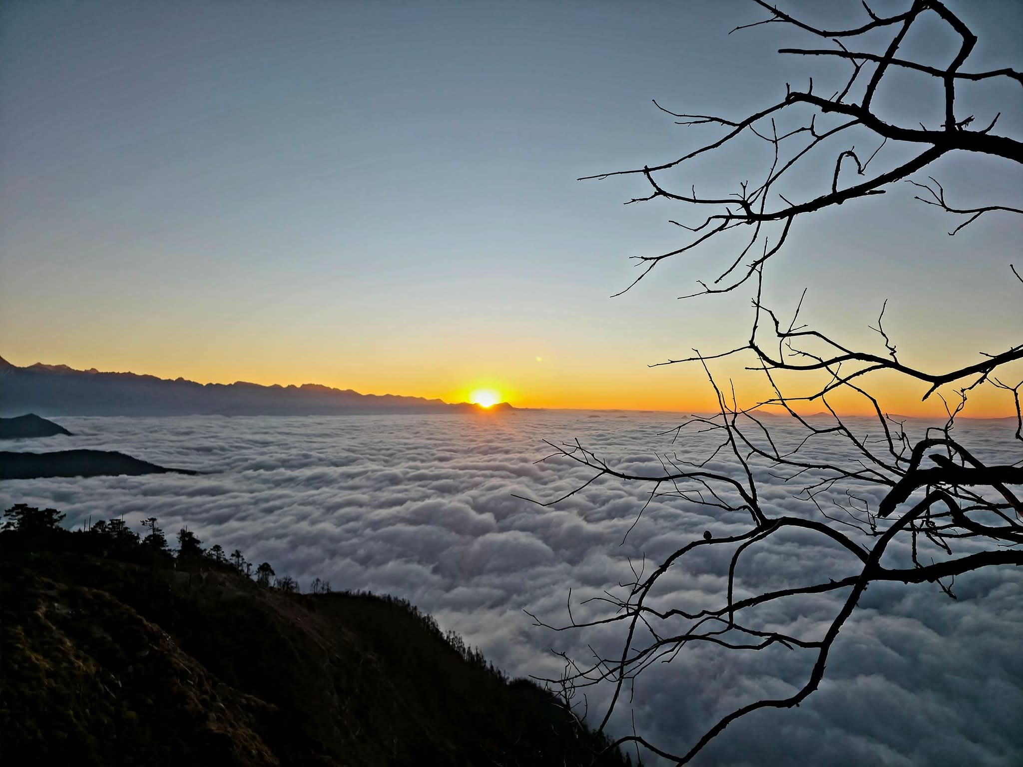 The image captured from the temple premises shows the sun slowly lifting above distant mountain ridges, framed by bare tree branches standing in silhouette against the glowing horizon. Below, clouds settled like an ocean, a common winter phenomenon in Nepal’s mid- and high-hill regions caused by temperature inversion and calm atmospheric conditions.