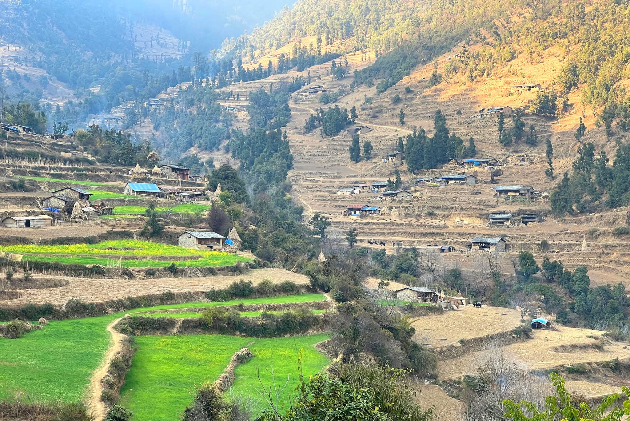 Surrounded by layered farmlands carved meticulously into the slopes, Tigrapani presents a landscape where green winter crops contrast against dry terraced fields and pine-covered hills. Stone houses with slate roofs dot the hillsides, while narrow foot trails connect homes, farms, and forests - forming the lifelines of this highland community.