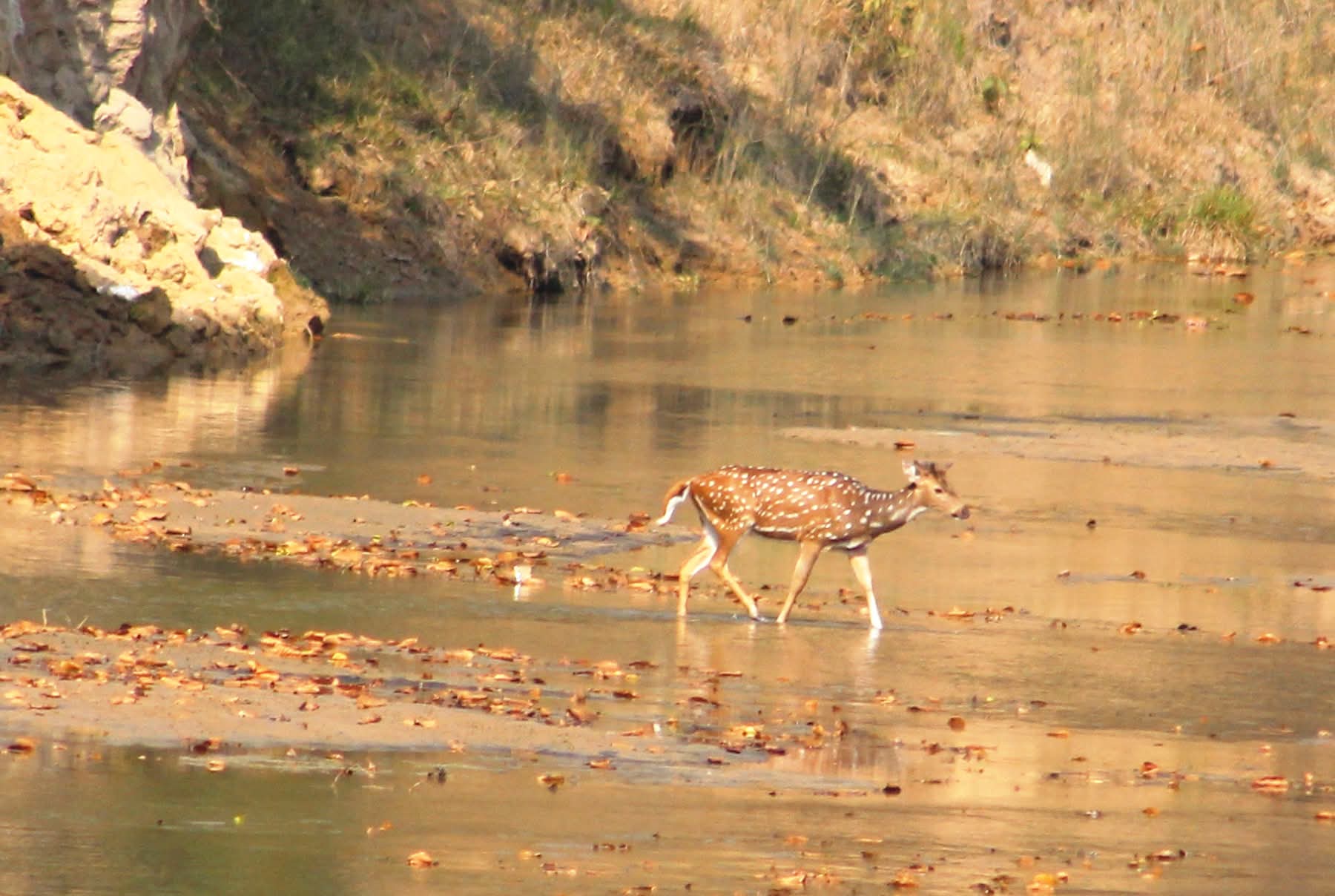 Photo: A chittal walks through the Syali River in Shuklaphanta National Park, Kanchanpur, while approaching the water to drink.