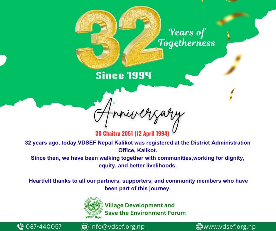 Kalikot, Nepal - The Village Development and Save the Environment Forum (VDSEF Nepal) has completed 32 years of its establishment, stepping into its 33rd year with a renewed commitment to social transformation, equity, and sustainable livelihoods.