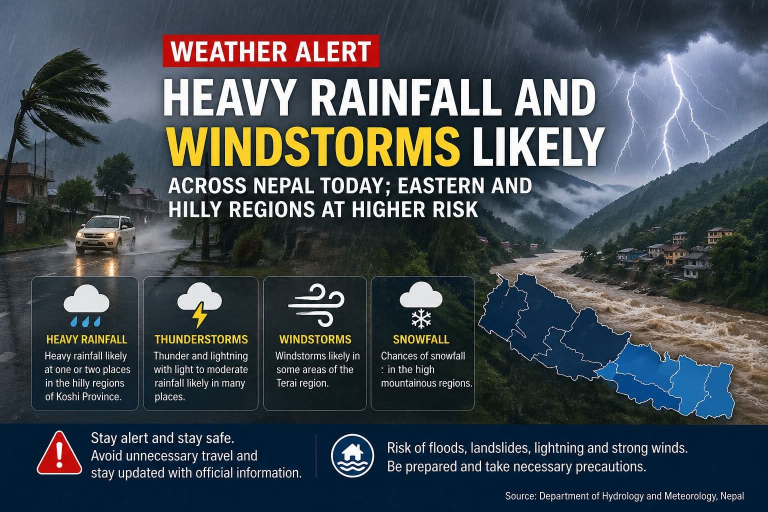 The Division has indicated a possibility of heavy rainfall accompanied by thunder and lightning at one or two locations in the hilly areas of Koshi Province. Additionally, windstorms are likely in some parts of the Terai region.